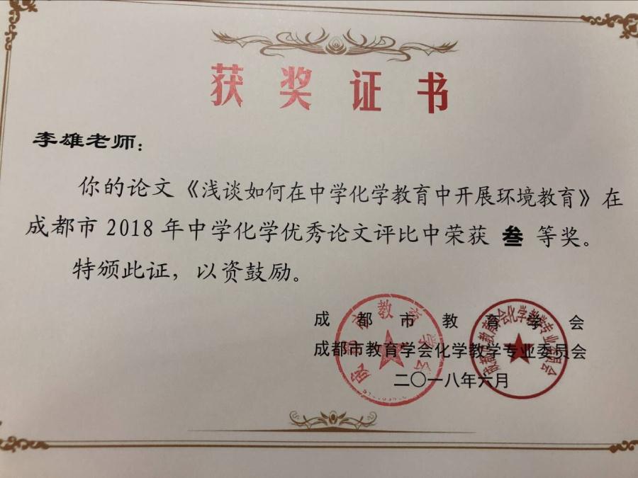 恭喜李雄老师的论文《浅谈如何在中学化学教育中开展环境教育》在成都市2018年中学化学优秀论文评比中荣获三等奖!