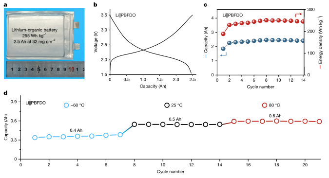 如图4所示,团队成功制备出首个安时级别的实用化有机软包电池(图4a-c)。该电池不仅能够在常温下稳定完成充放电循环,还表现出在极端环境下正常工作的潜力(图4d)。