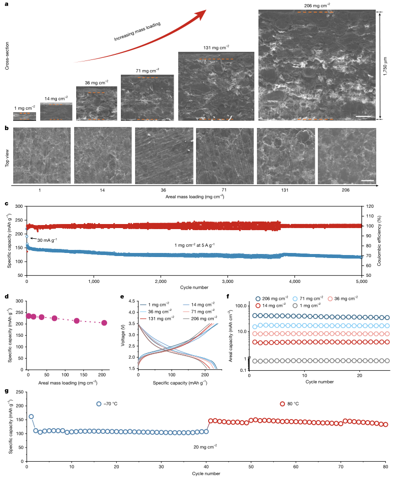 PBFDO电极即使在高负载条件下也未出现开裂或脱落现象(图3a-b),同时展现出稳定的充放电循环性能(图3c)。得益于PBFDO卓越的电子-离子传导性能,电池的容量几乎不受电极负载量的影响(3d-e)。即使在高达206?mg?cm?2的质量负载条件下,其比容量仍保持在200?mAh?g?1左右,且循环稳定性良好(图3f)。更令人瞩目的是,在20?mg?cm?2的高负载量下,该电池仍能在-70?℃至80?℃的超宽温度范围内稳定工作(图3g)。
