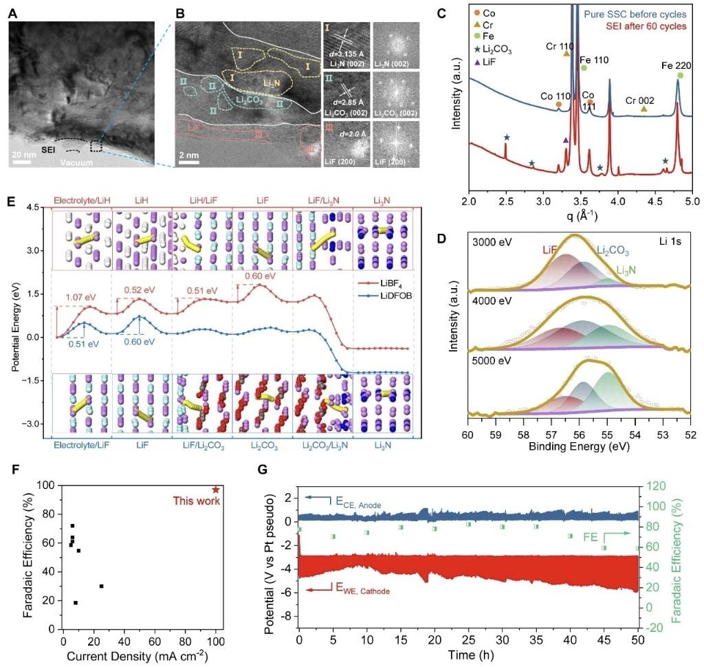 针对这一瓶颈,团队创新性构建功能分层SEI结构(DDLA),实现锂离子传输效率提升两个数量级。该多层级界面由LiF外层、Li2CO3离子传导层与Li3N界面层精准组成,大幅降低锂离子去溶剂化与迁移能垒,显著抑制析氢副反应,从原理上突破高电流密度下的界面稳定性难题。