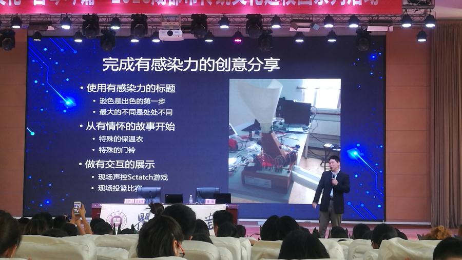 2018年5月23日,由成都市双流区教育局主办、成都市双流区研培中心承办的“瞿上讲堂”讲座在棠湖小学多功能厅进行,由付骞博士作专题报告——《创客教育理念下的STEM教育实践》,通过“验证型、探究型、制造型、创造型”四个类型;“发现问题——设计方案——实践方案——量现结果——分享改进”五个环节进行了综合阐述,与会教师受益匪浅,讲座圆满结束!