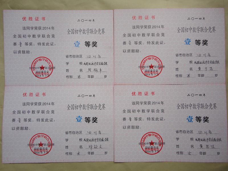 2014全国初中数学联赛我校一等奖获得者证书展示