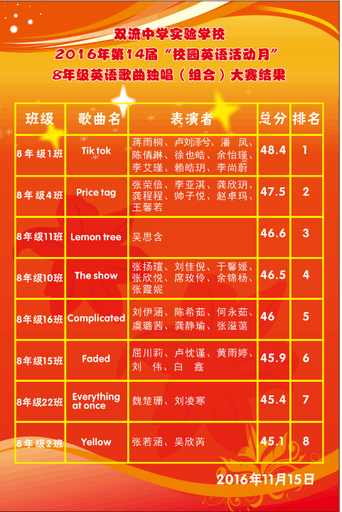 第14届“校园英语活动月”八年级英语唱歌比赛结果