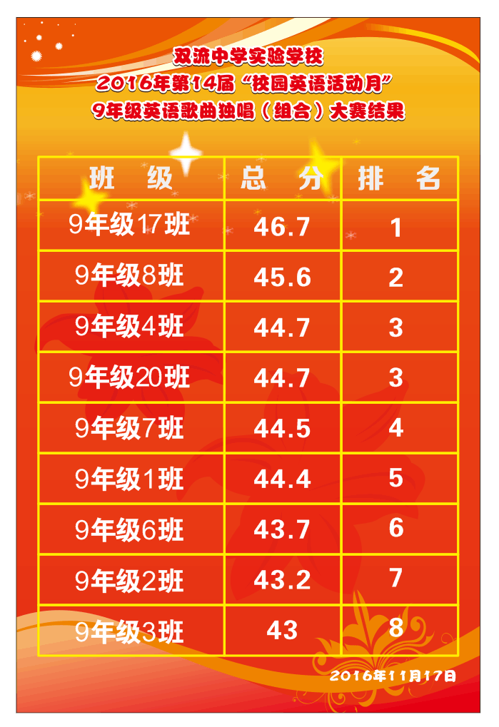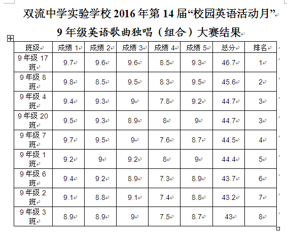 双流中学实验学校2016年第14届“校园英语活动月” 9年级英语歌曲独唱(组合)大赛结果
