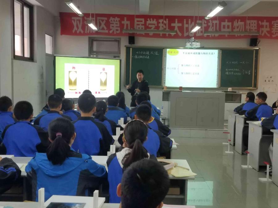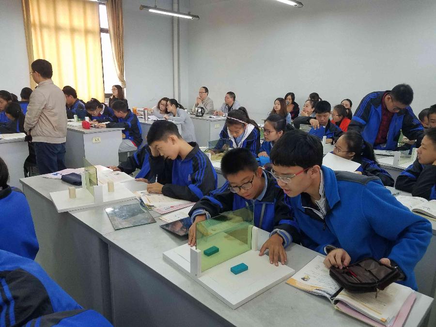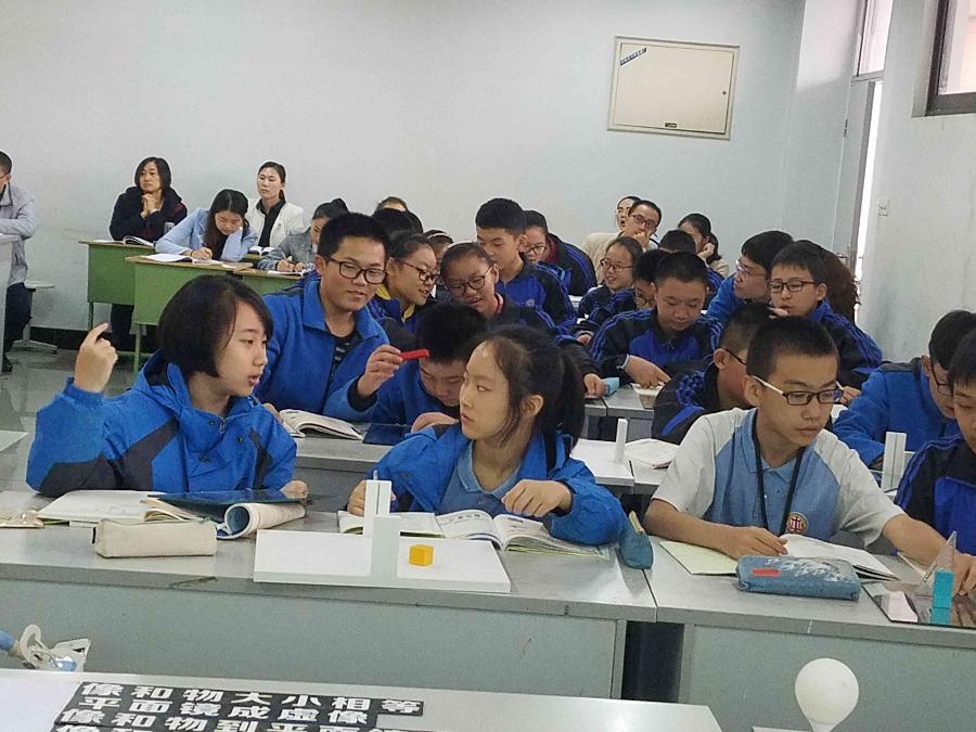 2017年10月12日下午,省市物理学科专家宋怀彬,郑其武老师莅临我校指导工作。首先,我组青年骨干教师何铁老师为来宾献上了一堂精彩的示范课,她带来的课题是《平面镜成像》。本堂课何老师作了精心准备,她利用自制的教具展示了伪全息技术引入课题,为学生学习创设出良好的情景,学生很容易进入学习状态。整个教学活动中,何老师基本功扎实,语言表述准确,对学生循循善诱,更结合了我校研究的课题《初中生健全人格教育》的研究成果,充分展现了年轻人的朝气与活力,获得了全体听课教师的一致好评。课后,两位专家和全组教师展开讨论,既肯定了何老师在教学活动中的优秀表现,也指出了何老师有待改进的地方,为何老师提出了宝贵的意见。