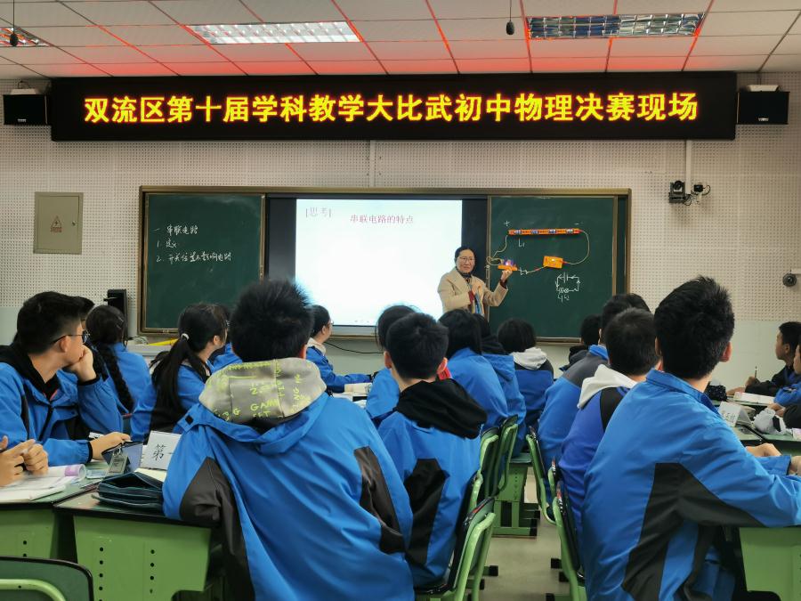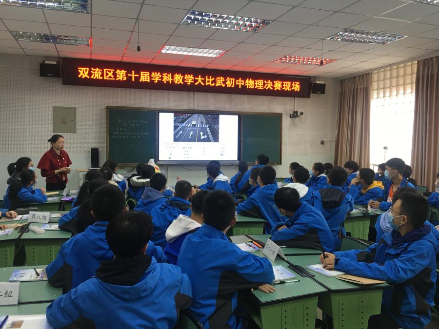 十年如一日,十年磨一剑。2020年11月5日,双流区第十届物理学科教学大比武决赛在双流中学实验学校如期举行。四川省物理教研员青春主任、成都市初中物理教研员郑其武老师、龙泉驿区物理教研员万斌老师、双流区教科院副院长李久和院长出席评委。学科教学大比武是每一个专业老师在专业上的追求和奋斗目标,在经过各学校的自主推选和区级较量,最终,7名选手脱颖而出,立足决赛的舞台,他们分别是:黄龙溪学校陈焘老师、棠湖外国语学校姜芹老师、九江初中淡红艳老师、双中实验学校刘曦萍老师、棠湖外国语朱小凤老师、双流艺体中学毛冬梅老师和棠湖中学的刘丽林老师。决赛将采取现场提前一小时抽签+现场展示+现场答辩的方式,来考验各位选手的学科知识积累水平和临场应变能力,短短一小时的准备,让每个选手都蓄势待发。