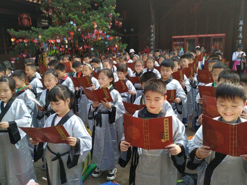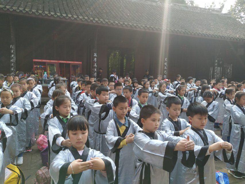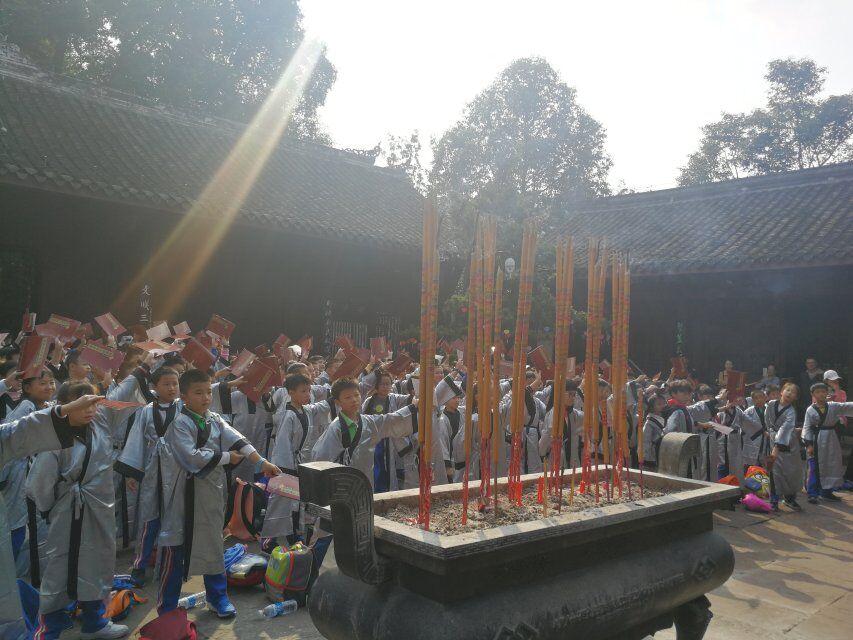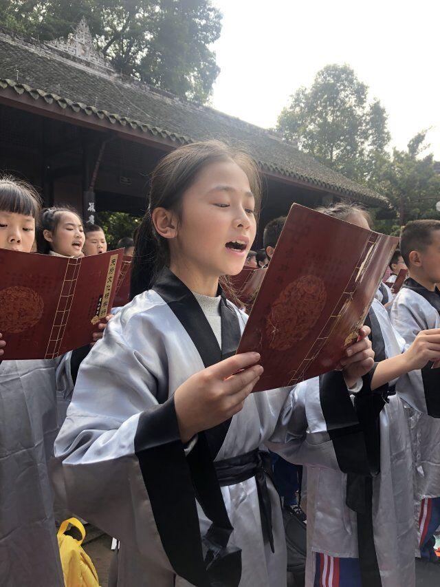 行至正殿外,孩子们身着国学服,和老师们一起吟诵经典。一曲《水调歌头》,让我们的思念穿越古今;一首《定风波》,把我们豪情定格在眉州。一场简单而祭拜,让我们在实践中知、行、研、悟。