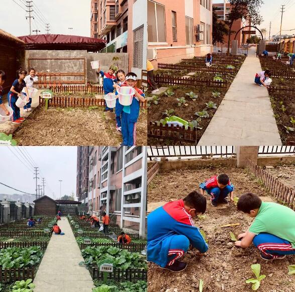 在附小的操场旁边有一块充满生命力的农场,它就是学校里的“青葵园”。同学们在科学老师的指导下,通过厚土栽培、翻土整理、埋种子、覆土、浇水等方式,用劳动和爱心在青葵园里种植了青菜、白菜、包菜、花椰菜、萝卜等有机蔬菜。