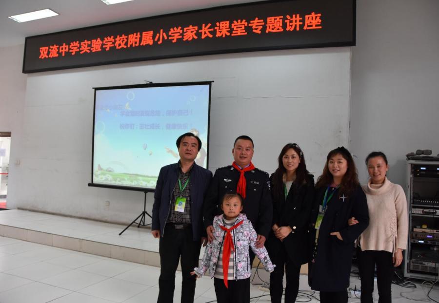 本次我校邀请了一年级二班徐礼恩的爸爸徐春光来主讲,以“珍爱生命远离危险”为主题。徐爸爸是双流公安局的一名刑警,从警十多年,职业经验丰富。课堂上,他身着笔挺的警装,威风凛凛,展示了警察的风采。礼恩给爸爸佩戴上鲜艳的红领巾,一下拉近了家长和师生之间的距离。徐爸爸精心筹备,讲座内容充实详尽,既富有教育的意义,又富有强烈的感染力。讲座形式精彩纷呈,图片资料,视频播放,实物展示等一应俱全;互问互答,气氛融洽;送给孩子们小礼物和子弹壳,真情满满。