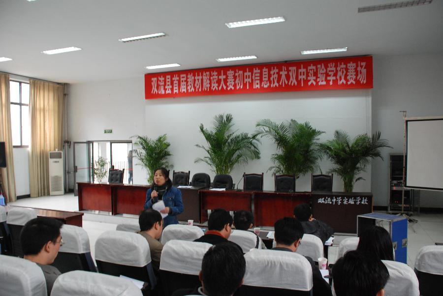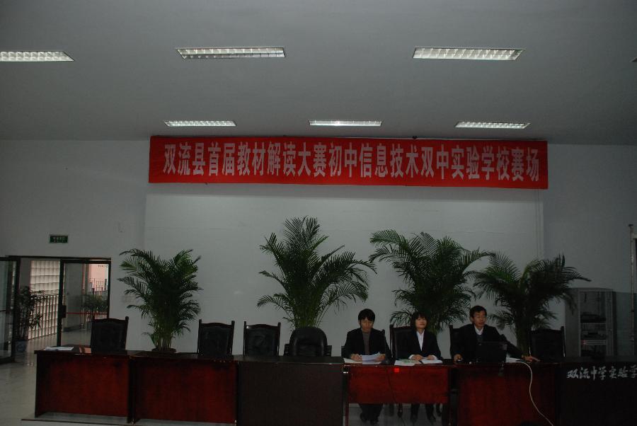 2011年11月4日,双流县首届初中信息技术教材解读大赛在双流中学实验学校举行。评委有来自成都市教科院的艾奉平老师、双流县研培中心王鹏老师和棠湖中学周昆老师。同时来访的还有郫县教培中心陈主任带队的教研员观摩团。
