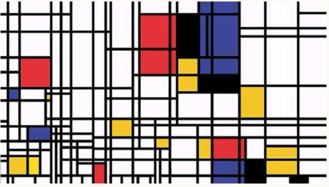 作于1930年的(红、黄、蓝的构成)是蒙德里安几何抽象风格的代表作之一。我们看见,粗重的黑色线条控制着七个大小不同的矩形,形成非常简洁的结构。画面主导是右上方那块鲜亮的红色,不仅面积巨大,且色度极为饱和。左下方的一小块蓝色、右下方的一点点黄色与四块灰白色有效配合,牢牢控制住红色正方形在画面上的平衡。在这里,除了三原色之外,再无其他色彩;除了垂直线和水平线之外,再无其他线条;除了直角与方块,再无其他形状。巧妙的分割与组合,使平面抽象成为一个有节奏、有动感的画面,从而实现了他的几何抽象原则,“借由绘画的基本元素:直线和直角(水平与垂直)、三原色(红黄蓝)和三个非色素(白、灰、黑),这些有限的图案意义与抽象相互结合,象征构成自然的力量和自然本身。”