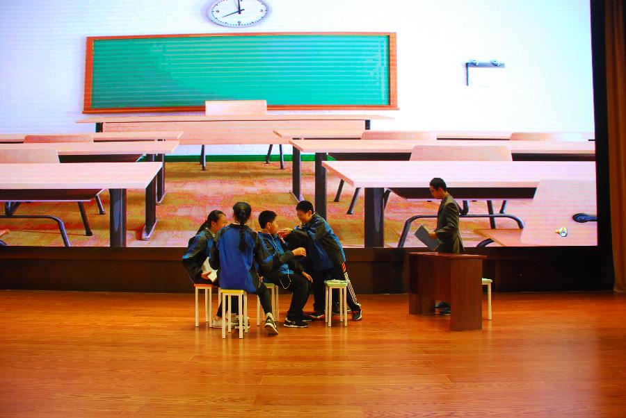 为了给观众呈现一场精彩的表演。小演员们在学习之余,利用中午、下午和周末的休息时间进行排练。往往是一幕的演员在排练时,其他演员还在抓紧时间做作业。