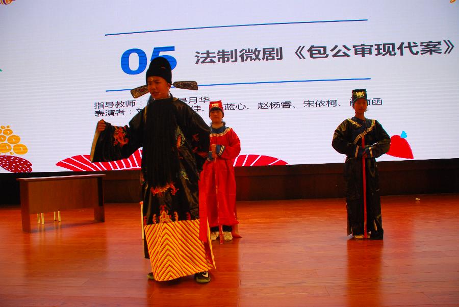 第二个表演的剧目是《包公审现代案》,讲诉了铁面包公穿越到了现代,在两名现代警察的协助下,审理“不良少年”胡非为违法犯罪一案。学生扮演的包公因不熟悉现代法律,闹出了很多误会,但还是在警察的协助下,运用现代法律,依法审判了胡非为。包公的表演引起现场观众阵阵笑声,两位警察也为学生普及了很多法律知识,“不良少年”的成长经历也让人唏嘘不已。