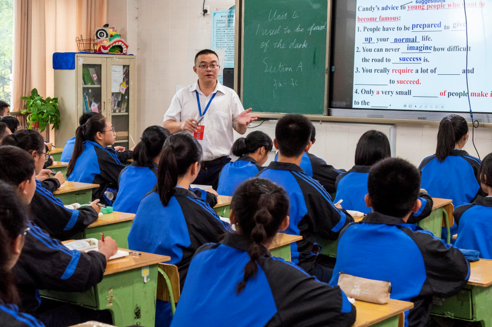 正高级教师、成都市学科带头人、优秀教师文传福给学生上课