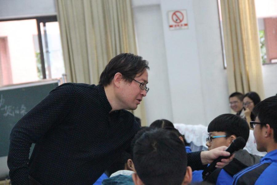 下午14:00整,来自重庆市万州中学语文高级教师牟其明老师带来了一堂生动的《都江堰》课。为了让同学们品味都江堰水的魅力,领悟都江堰的不朽功勋,牟老师用诵读、点拨、探究等方式提出问题,与学生互动,探索文本的魅力,讲到兴起之处,牟老师清唱《我的中国心》引得同学们掌声连连,在课堂末端,牟老师带领同学们探究“人之魂”,研讨都江堰为自己流泻出的独特精神世界。