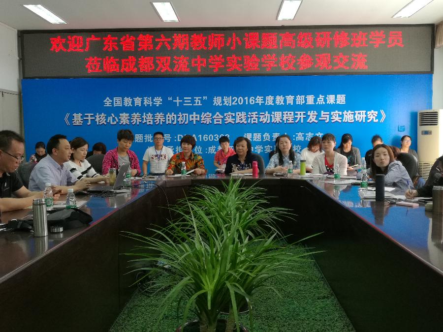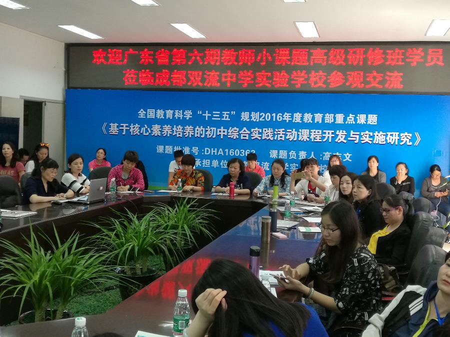 2017年5月11日,广东省教师继续教育学会举办的广东省第六期教育科研课题研究高级研修班学员(分管教育科研的校长或教科室主任)50余人到我校考察学习交流,双流区研培中心理论室易恩主任主持会议。