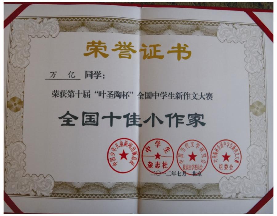 四川省作协会员、中国当代文学研究会会员、被誉为“中国最年轻的作家”、春芽文学社荣誉社长社长万亿已出版小说《暖雪》、《十三岁的花季》、《夏桃子的紫色年华》、《我在成都等你》等七部,在《少年作家》、《青年作家》、《萌芽》、《意林》、《四川文学》等全国著名文学刊物上发表短篇小说、散文近百篇。20127月,在“第十届‘叶圣陶杯’全国新作文大赛”上,万亿荣获全国初中生唯一“全国十佳小作家”荣誉称号,文学社9名会员荣获一等奖,14人荣获二等奖。201212月,在“第二届全国校园文学高峰论坛暨成果展评”活动中,万亿以第一名的身份摘得“新苗奖”,并作为全国学生代表在会上发言;2013年,万亿更是被中央编译出版社聘请为《校园风尚》书刊主编,成为“中国年龄最小国家级刊物主编”。
