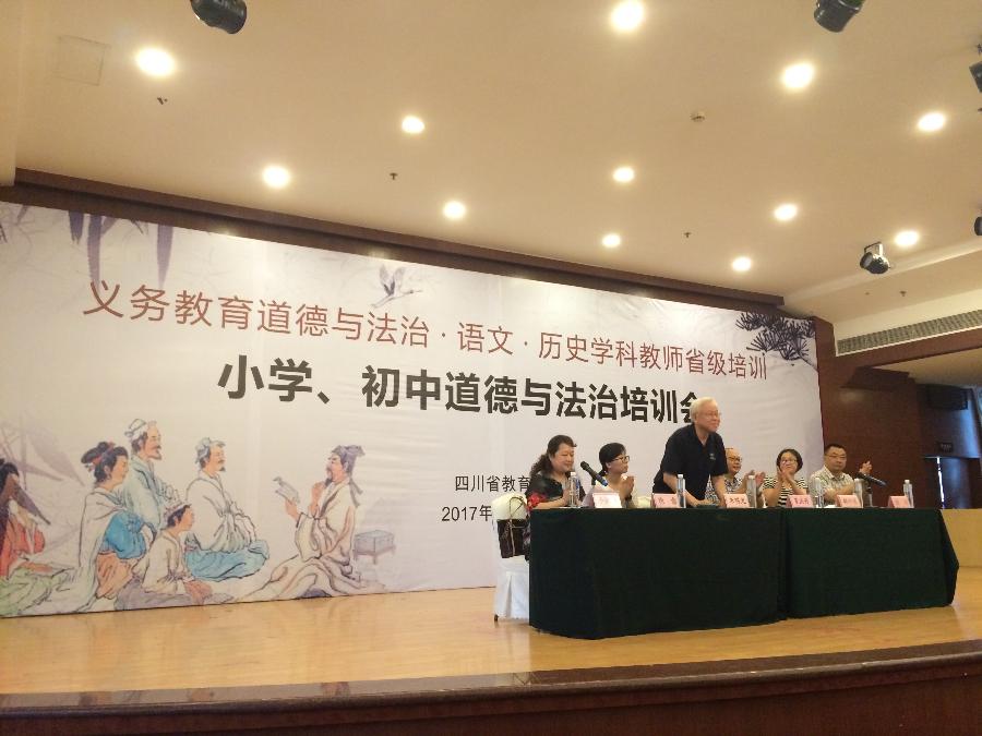 本次培训由四川省教科所组织,邀请到了人民出版社副总编辑朱明光老师,教材七年级上册编写者吴蓉老师和张学军老师、省教研员李淑英老师为到会老师做培训。台下就坐的四川省各市州、各区县的教研员及骨干教师。