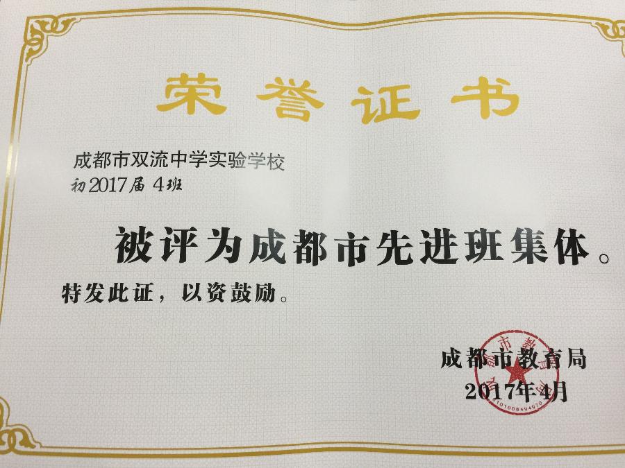 巧巧老师所带的班级——2017届4班获得“成都市先进班集体”荣誉称号实至名归。