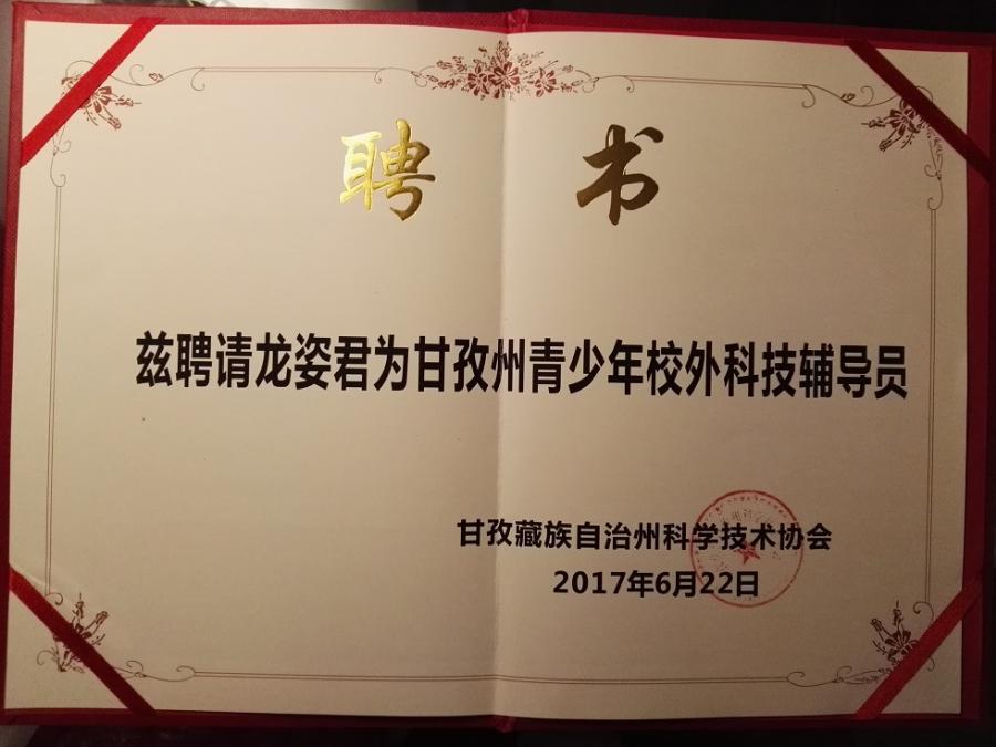 2017年6月20日—23日,由四川省青少年科技活动中心携手甘孜州科协、甘孜州教育局共同举办的甘孜州第三届青少年科技辅导员及组织工作者培训班上,我校青年优秀教师龙姿君老师被邀请作为省专家培训团授课老师前去授课。
