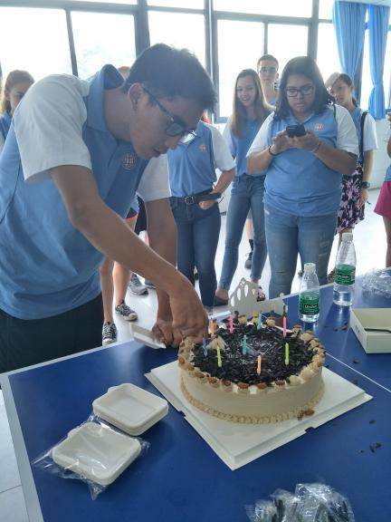 快乐的时光让学生们流连忘返,依依不舍地离开熊猫基地后,还有另外的惊喜等待着他们。7月7日这天是Benjamin罗杰明的18岁生日,学校老师在他完全不知情的情况下,为他在学校准备了一个surprise birthday party,大家为他齐唱生日歌,送上了最美好的祝福!(陈幸)