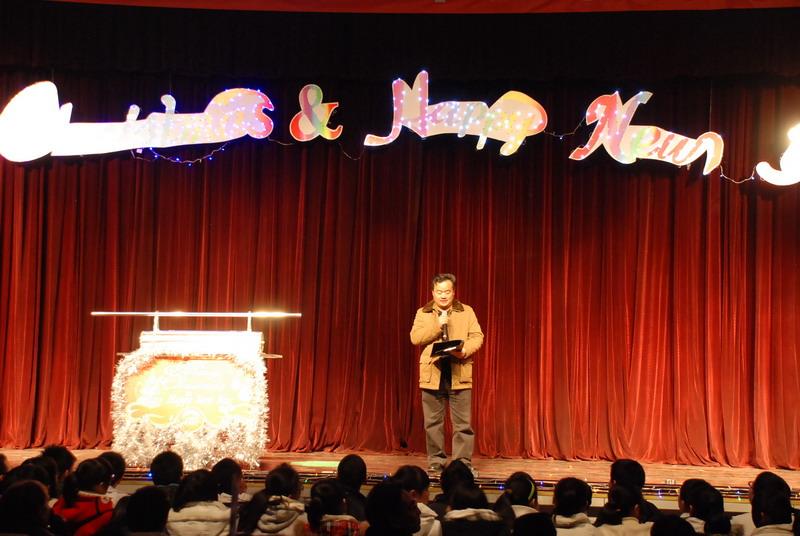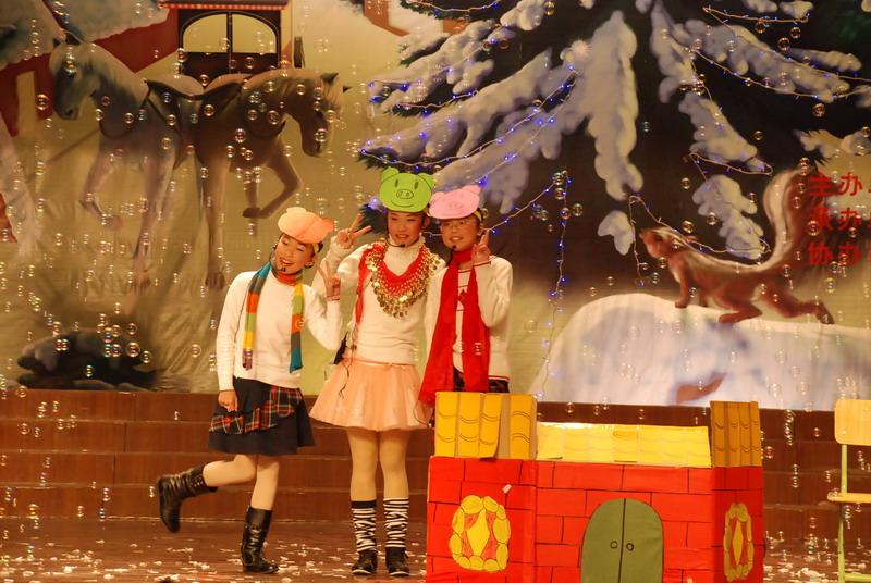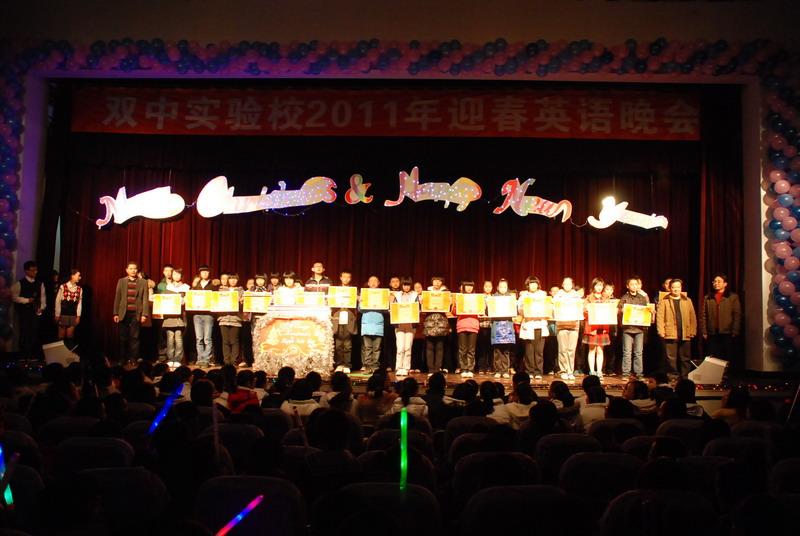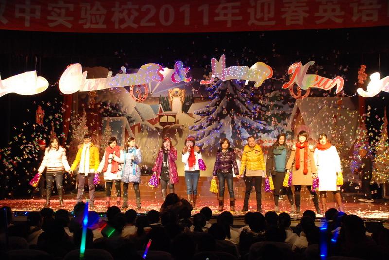 一曲活力四射的《Locking》点燃了在场师生节日的激情.歌曲《 Sorry》、《Parazzi》、《Innocence》《Tell me why》诗歌、短剧《Three Little Pigs 》、《Beauty and the beast》《Forgiveness》、《Snow White》,歌舞《剪纸》等十余个同学们自编自创的节目轮番登场,同学们身着节日的盛装时而情真意切、时而幽默搞笑、时而动感十足,时而如痴如醉……声情并茂而又形象生动的表演,带给了在场师生时尚、幽默、欢快的春天气息和新年的温馨!