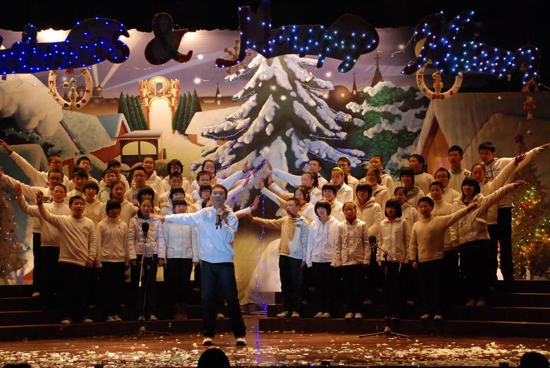 当欢快的音乐响起,新年的祝福也带到了每一个人身边:身着红衣的圣诞老人将五颜六色的水果糖、美丽的卡片洒向在场师生,晚会上现场汇成了一片欢乐的海洋。最后,7年级的全体英语女老师和外教带来了宁静、优美的《Christmas Comes to the Town》,男教师们一曲动感十足的舞蹈《Nobody》使全场观众欢声雷动,掌声、烟花覆盖了全场,晚会达到了高潮!