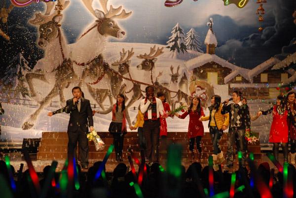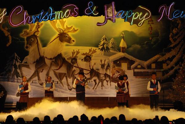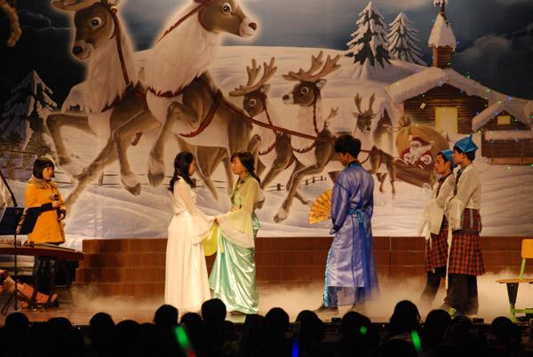 本次晚会上的节目是由同学们自编、自导、自演的,也是从第十届英语文化活动月中被选出的优秀节目,节目形式各异、内容丰富,有英语歌曲合唱、英语诗朗诵、英语短剧、舞蹈表演等。一些经典短剧如《Snow  White》、《Liang  Zhu》、《The  Angel  of  Heaven》再现舞台,受到同学们的热烈欢迎;诗歌朗诵《Facing  the  sea  with  spring  blossoms》轻松明快,引领同学们进入到面朝大海,春暖花开的美好画面;Michael  Jackson式舞蹈是历年晚会的保留节目,本次晚会上Michael  Jackson舞蹈串烧再次向经典偶像致敬,引爆师生热情,全场Hight翻天。由学生扮演的圣诞老人两次出现在观众席,为同学们派发圣诞礼物,活动现场汇成一片欢乐的海洋。晚会在外教和2015级全体英语教师的大合唱中划下了圆满的句号。