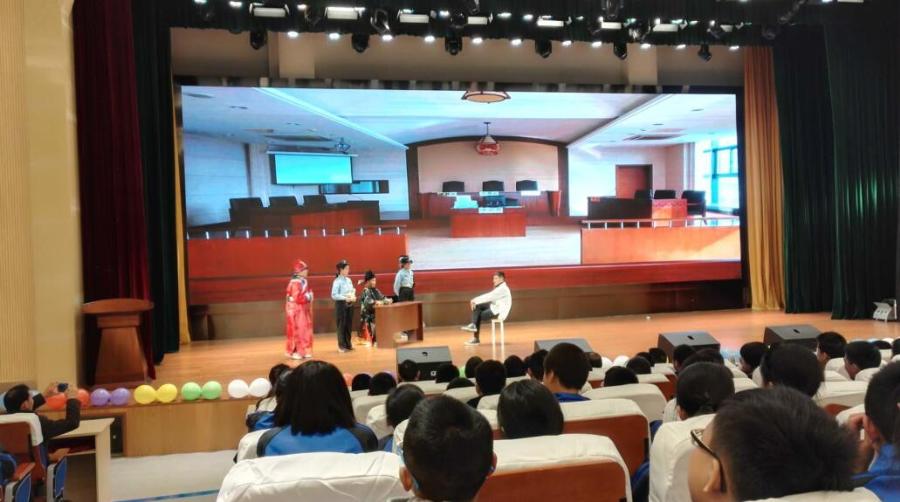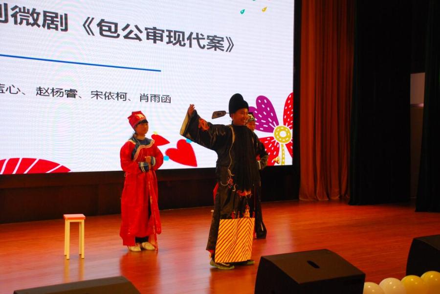 第二个表演的剧目是《包公审现代案》,讲诉了铁面包公穿越到了现代,在两名现代警察的协助下,审理“不良少年”胡非为违法犯罪一案。学生扮演的包公因不熟悉现代法律,闹出了很多误会,但还是在警察的协助下,运用现代法律,依法审判了胡非为。包公的表演引起现场观众阵阵笑声,两位警察也为学生普及了很多法律知识,“不良少年”的成长经历也让人唏嘘不已。