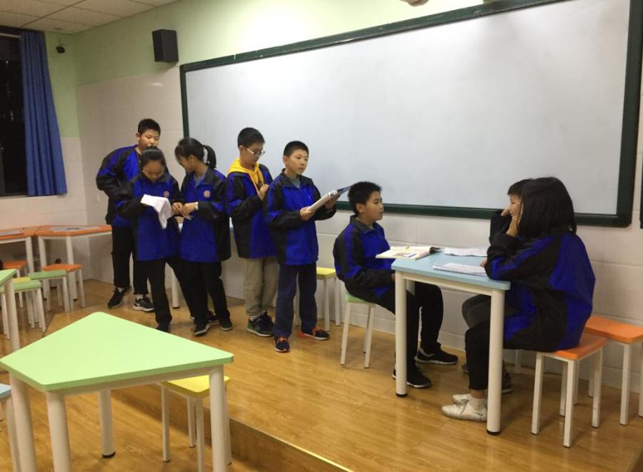 为了给观众呈现一场精彩的表演。小演员们在学习之余,利用中午、下午和周末的休息时间进行排练。往往是一幕的演员在排练时,其他演员还在抓紧时间做作业。