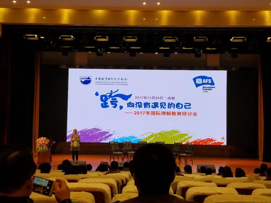 11月24日,以“跨向没有遇见的自己”为主题的2017年国际理解教育研讨会在双流中学实验学校多功能厅举行,会上来自全国各地的老师们从中国地区文化理解开始进行了深入的探讨,然后话题引向了国际理解教育,各地代表各抒己见,分享了自己所在的学校和地区是如何开展国际理解教育的。随后举行了AFS项目35周年庆典活动,四川省教育厅国际交流与合作处处长廖飞出席了活动。
