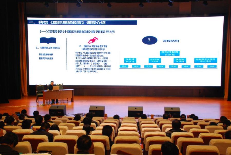 下午4点半,全体与会人员齐聚多功能厅,聆听了双流中学实验学校校长高志文题为《AFS项目与国际理解教育》的专题报告。成都双流中学实验学校于2017年7月-8月举行了AFS NSLI-Y项目。为期40天的2017成都双流中学实验学校AFS-美国NSLI-Y项目于8月9日圆满结束。项目得到了学校领导机构的全力支持,学校组建了拥有对外汉语教学经验的优秀汉语教师队伍并进行了为期半年的培训,系统开发了汉语教学课程,文化体验课程和社区服务课程。28名美国学生每天5个小时的汉语学习,每周两个小时的中国文化体验课,每周一次的社区服务,以及与入住家庭的生活互动,让他们的汉语水平有了突飞猛进的提升。通过本次AFS NSLI-Y项目,双中实验向世界发出了中国的声音,传播了本土的文化,得到了与会专家和代表们的高度评价和一致肯定。高校长从课程目标,评价机制和实施途径等几个板块介绍了双流中学实验学校的国际理解课程;该课程以学科渗透,综合实践活动课程,国际游学课程,短期留学及国际班为具体实施途径。开始实施国际理解教育课程以来,双中实验与德国,英国,美国等友好学校国际交流已超过30次,参与师生总人次超过3000人次,并和全美排名前25的美国华盛顿州圣乔治中学合作开办圣乔治国际教育中心和中美高中课程班。学校还先后获得了英国教育协会颁发的“中英校级国际交流大奖“,“中美‘千校携手’项目学校”,双流区首批教育国际化窗口学校,成都市首批教育国际化窗口学校等荣誉。