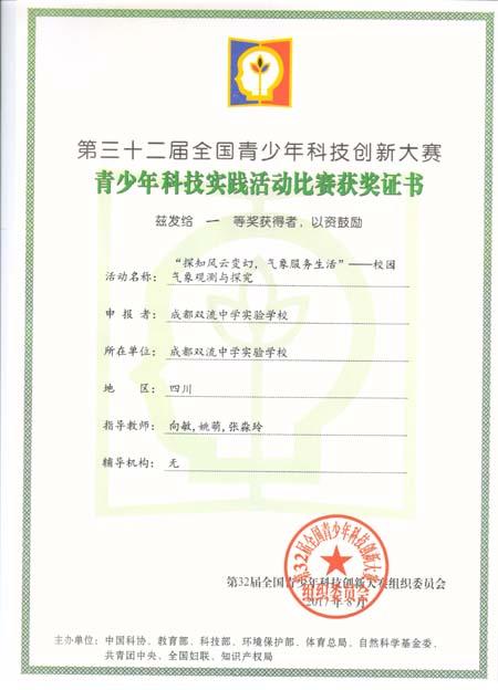 科技实践活动《探知风云变幻,气象服务生活——校园气象观测与探究》源于我校小组研究性学习课题——校园气象站研究。课题研究中,学生根据地理、生物、物理、人文、资源、环境等问题,自主提出假设、设计方案、查阅资料、设计模型、调查访问、实验验证、分析数据、得出结论。并通过走进校园气象站、双流区气象局、气象台、气象站,双流区科协、成都信息工程大学气象学院、四川省气象局现场考察,向专家学习。在校园气象站建设阶段,由课题研究小组结合学校现有条件,自主设计、选址、规划、建设。学生利用绘图软件自己设计绘制校园气象站规划图,利用各种材料自建气象站模型,制作了简易风向仪来观测校园的风向。在校园及周边空气质量调查过程中,学生通过研究粉笔灰尘对空气质量的影响、校外烧烤摊贩对校园周边空气的影响等,该活动取得了良好的社会效益,征服了评委,获得全国一等奖的桂冠。
