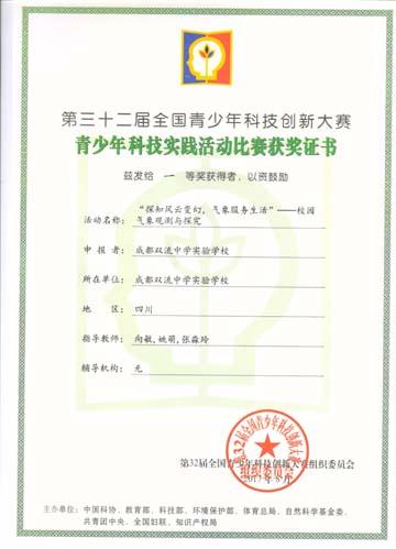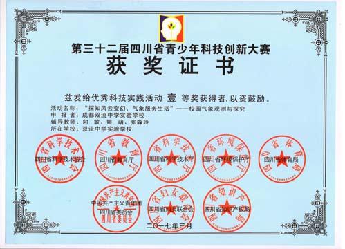 2017年12月,我校学生在成都市第33届青少年科技创新大赛中取得了优异的成绩。学生科学论文91篇(105人次)获奖,其中2018届14班学王玉娇和2019届15班刘佳合作的《利用废旧手机完成3D视频拍摄探究》荣获本届大赛的最高奖项——英才奖(王伟老师指导),《空中生态园—羊肚菌种植实验研究》《对天然“灭蚊剂”的研究》《对菌霜的研究》等8篇分别荣获一等奖, 37篇荣获二等奖,45篇荣获三等奖;创造发明37项获奖,其中2019届15班张蓉的《海面雨棚》(段绪德老师指导)荣获一等奖,13项荣获二等奖,23项荣获三等奖;信息学项目605项获奖,其中60项荣获一等奖,239项荣获二等奖,306项荣获三等奖;科幻画29幅获奖,其中7幅荣获一等奖,17幅荣获二等奖,5幅荣获三等奖。信息学荣获团体一等奖,科学论文、发明创造荣获团体二等奖。教师方案《北京科技夏令营课题方案》(段绪德、吕惠兰、龙姿君合著)荣获一等奖,范勇波老师的小组研究性学习课题《探究身边人的口述历史研究报告》荣获二等奖,余蕾的《垃圾分类处理研究性学习教师课题研究方案(2019届)》荣获三等奖。