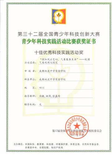 2017年,我校向敏、姚萌、张淼玲三位老师指导的科技实践活动《探知风云变幻,气象服务生活——校园气象观测与探究》荣获优秀科技实践活动省一等奖、全国一等奖,并且荣获全国十佳优秀科技实践活动奖。