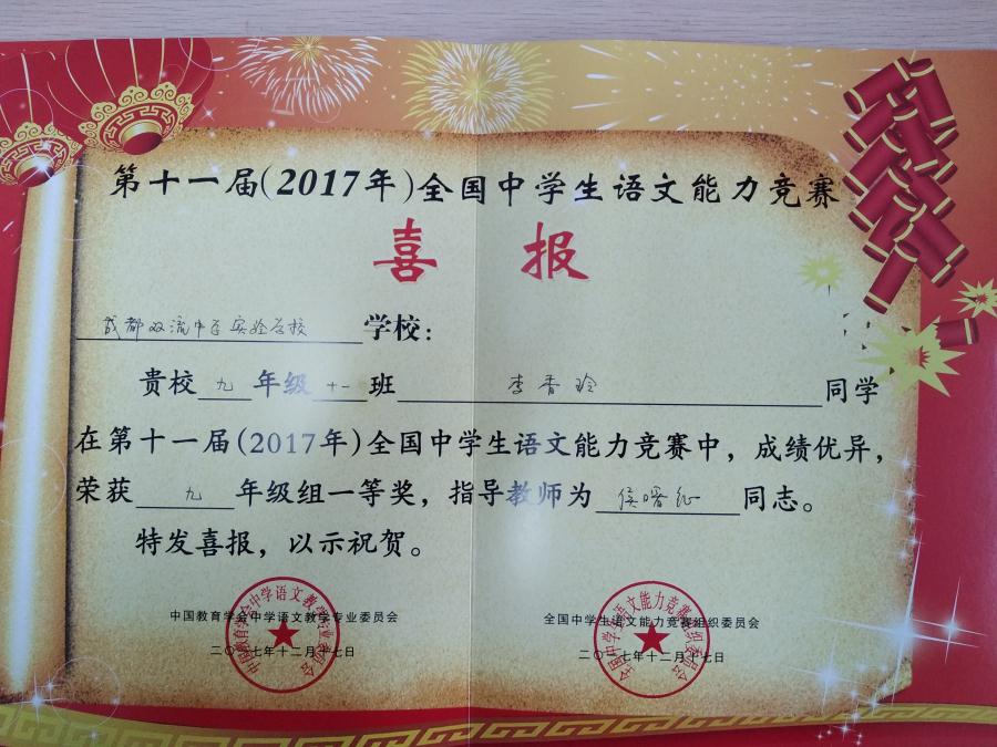 在2017年全国中学生语文能力竞赛中,双流中学实验学校学生喜获佳绩:15人获得全国一等奖,49人获得全国二等奖,85人获得全国三等奖,338人获得省级奖。在此,向获奖同学表示热烈祝贺!(语文组 田海明)