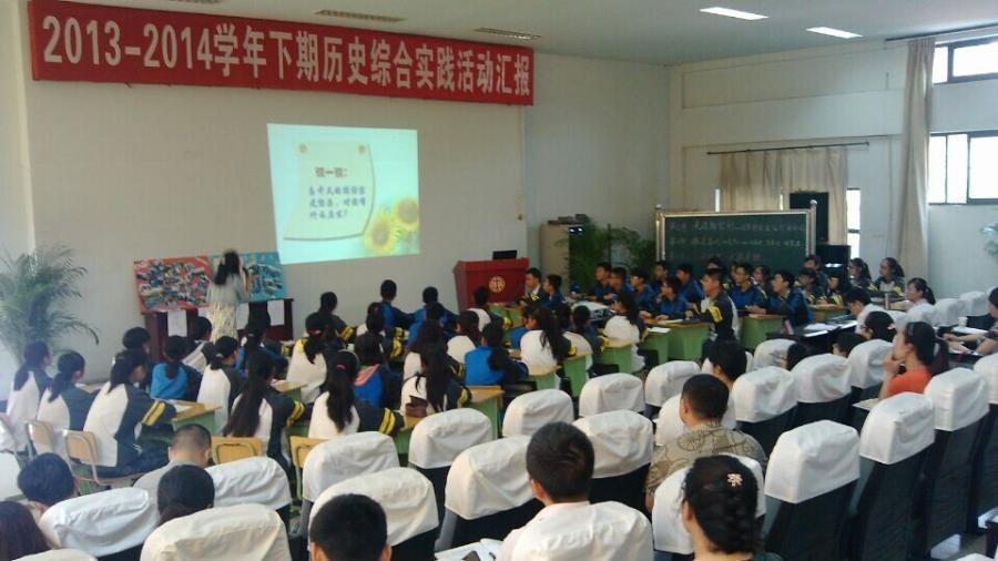 2013—2014年度下学期双流县历史综合实践教研活动在我校举行历史组 范勇波 5月30日上午,双流县历史综合实践研讨活动在我校学术厅隆重举行。历史组何玲、张耀辉、李然等三位教师向全县历史教育教学同仁展示了三节精彩纷呈的综合实践活动课,课题分别是《白果村衣食住行面面观》《三国故里 武侯寻踪》《年代记忆—讲家史 访家史 写家史》,既有校外大型课题,也有校内小课题活动课。