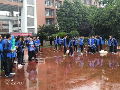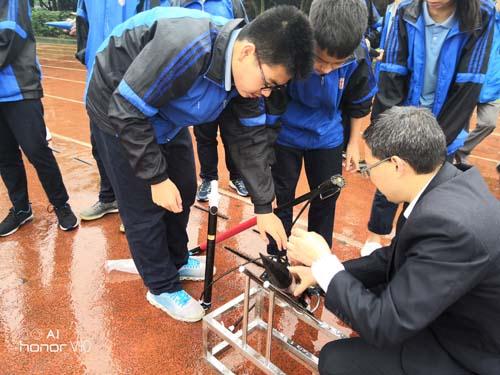 下午,物理老师们早早地来到运动场,放置好水火箭发射架,准备好打气筒,用警戒线拉出了安全区域,做好了各项相关准备工作。参赛同学们带着他们精心制作的五十多只精品 水火箭”,迫不及待聚集到了运动场。