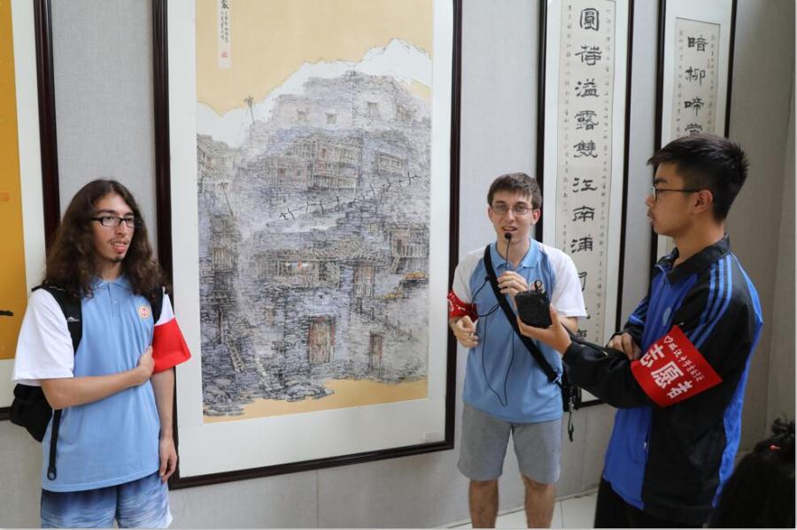 美国学生用中文在双流区双流图书馆完成志愿者解说介绍。从一楼的展览到二、三楼图书陈列再到文物展区,听双流图书馆文物展解说员解说。