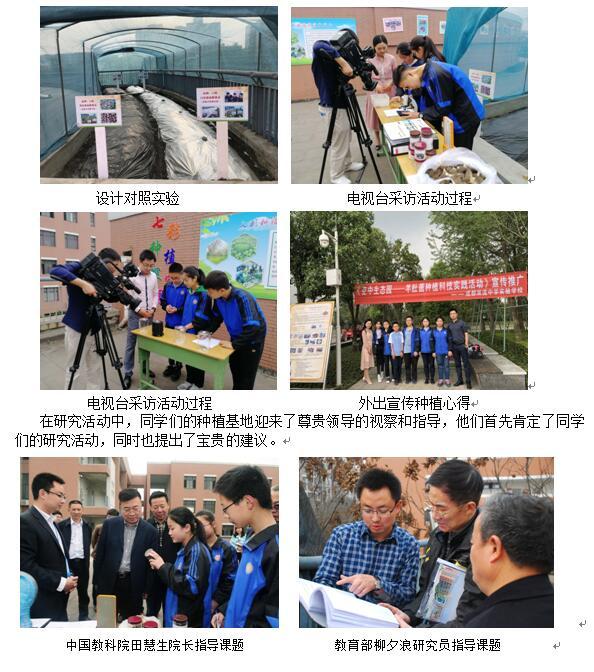 我校以课程改革为核心的素质教育为办学模式的引领下,大力开发综合实践活动课程已是十多年。2016年8月《基于核心素养培养的初中综合实践活动课程序列开发与常态实施研究》课题被列为全国教育科学“十三五”规划教育部重点课题。先后被评为成都市政府教学成果一等奖、四川省政府教学成果一等奖,全国教育教学成果奖二等奖。《空中生态园——羊肚菌种植科技实践活动》在学校综合实践活动课程大背景下应运开展起来,研究活动开展两年多来,学校坚持“以局部带动整体”的思路,在七八年级各班选拔组员,成立总课题组。总课题中的各子课题大都来源于参与体验羊肚菌种植中发现的问题,做到“小问题,真研究”,杜绝假大空。通过近两年的研究,我们也收获了不少的成果,形成了独特的研究产品,同时也证明了在屋顶、平台种植羊肚菌是可行的。代昊坤、廖宇嘉、彭浩、李浩、夏雪、陈智星等多位同学撰写的论文荣获第三十三届成都市科创大赛论文一等奖;同时代昊坤同学的小发明“羊肚菌采摘器”获中华人民共和国专利受理通知书。2018年1月,《空中生态园——羊肚菌种植科技实践活动》作为为成都市唯一一个科技实践活动被推荐参加第三十三届四川省青少年科技创新大赛,被评为四川省一等奖。