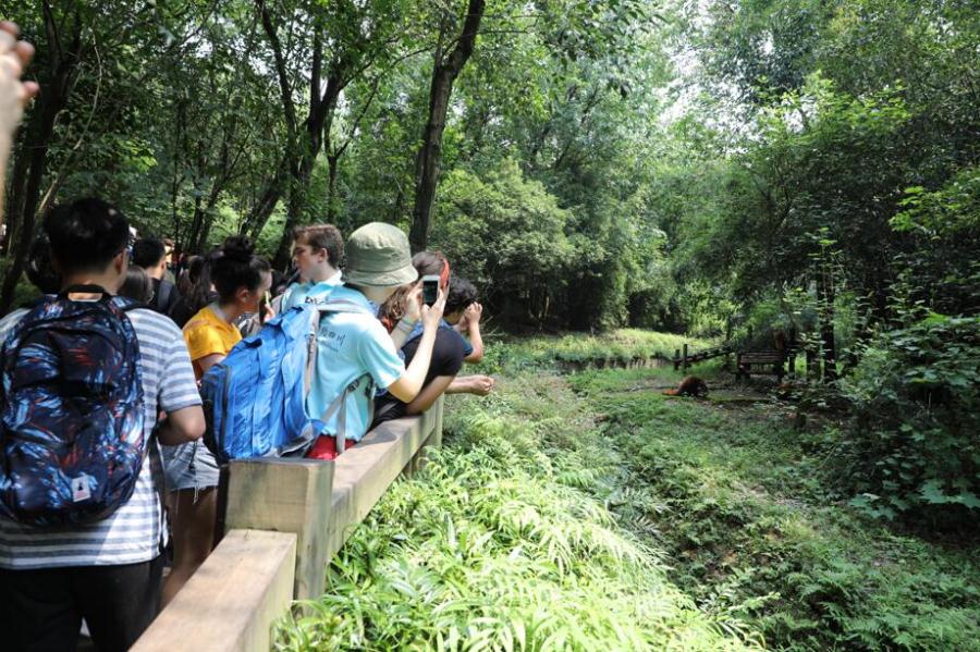 随后坐上大巴,29名美国学生前往他们一直期盼的“熊猫基地”看他们最爱的“大熊猫”。尽管艳阳高照,酷暑难耐,也丝毫无法阻挡小哥哥小姐姐们见到熊猫本尊的热情。他们分别见到了出生两个月处于最萌状态下的大熊猫,更有十个月大、两岁大、十岁大的各阶段画风迥异的大熊猫。美国学生们纷纷用手机拍摄下熊猫们的各种状态,还有学生兴奋地喊出标准的四川话“大熊猫儿,好乖哦”。