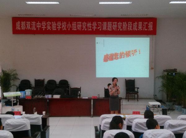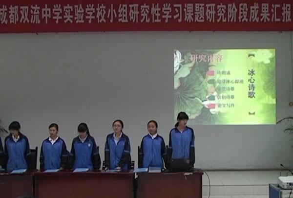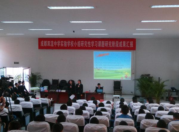 两周来,各课题小组的学生分别对《冰心诗歌》《传承历史文脉,守望精神家园—成都非物质文化遗产研究之走进川剧》《校园气象站》《迎外国友人,品双流风采—为双流国际化添“英”加“图”》和《双流县城垃圾处理现状及展望》等研究课题以图文并茂和作品展示的形式进行了形象生动的汇报展示。