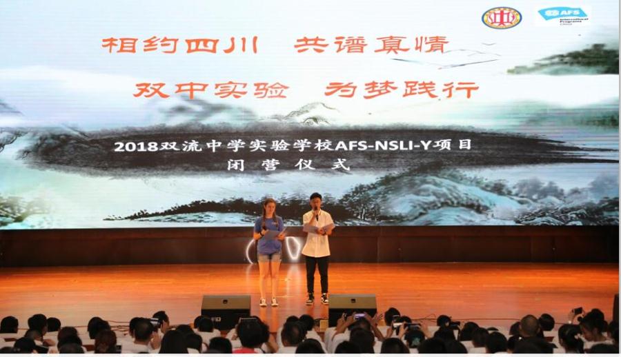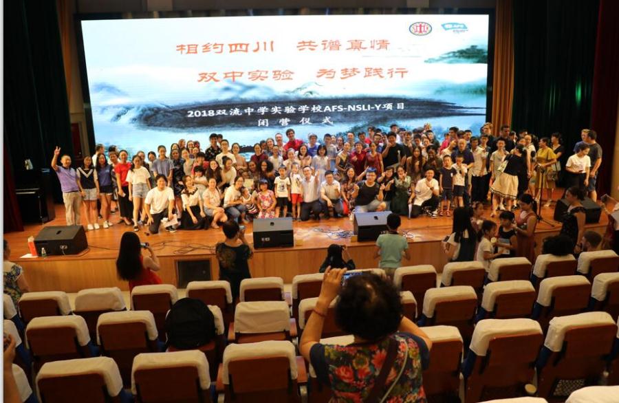8月9日下午主题为“相约四川、共谱真情、双中实验、为梦践行”的2018双流中学实验学校AFS-NSLI-Y项目闭营仪式在我校国际部多功能厅举行。四川省教育厅国际交流中心项目负责人张展英、双流中学实验学校校长助理罗晓章、双流中学实验学校外事办主任杨红出席了闭营仪式,与29个接待家庭一起见证这29名美国学生的成长。