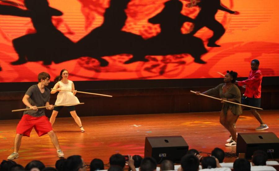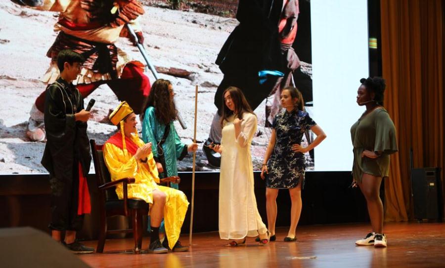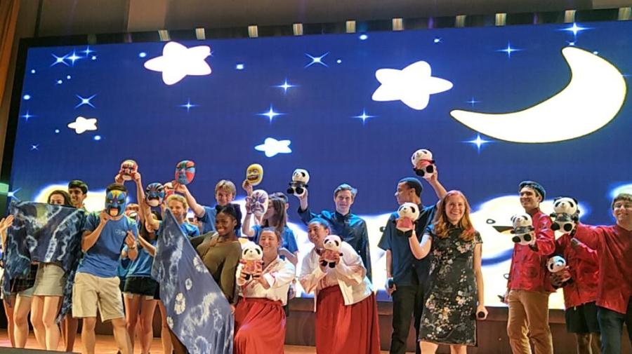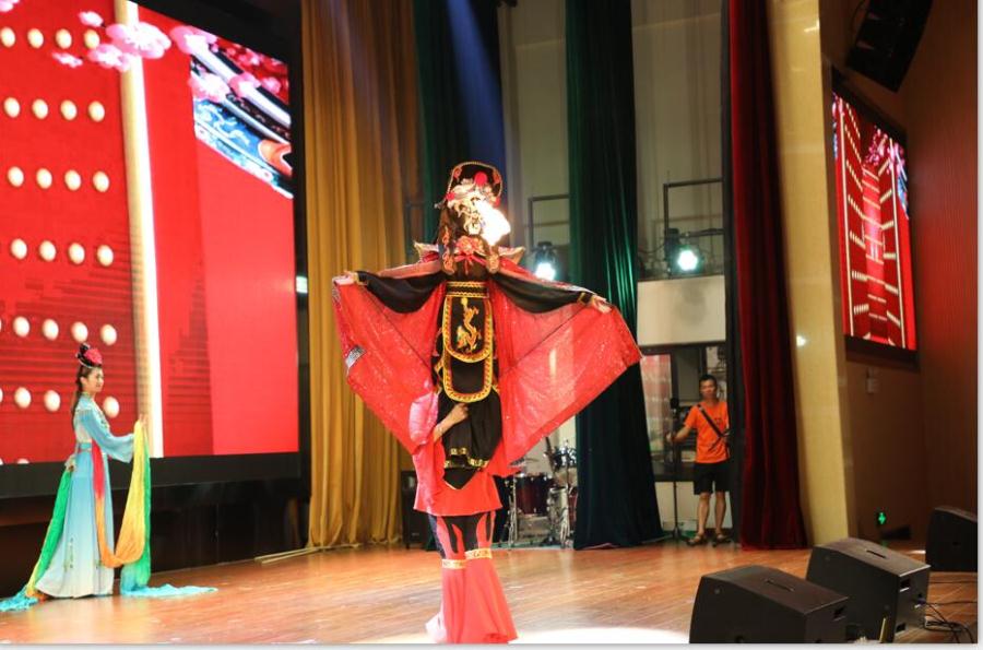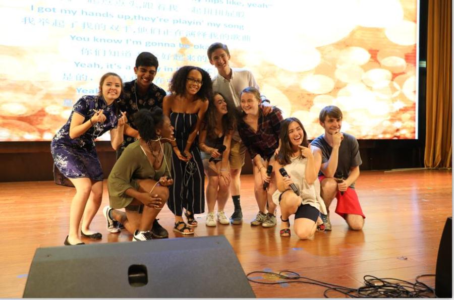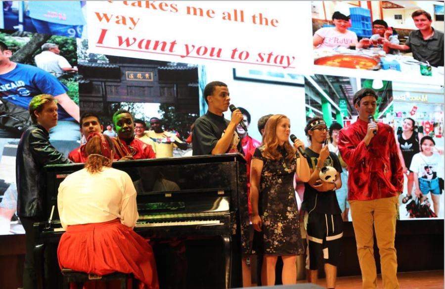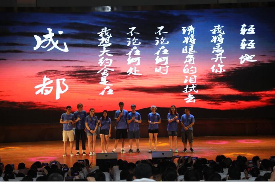 随后,29名美国学生为大家呈上了一台精彩纷呈、形式多样的汇报节目。朗诵和吟唱并用的《诵别离》让大家感受到了依依不舍的离别情;一场美国版的“三打白骨精”,爆笑全场;有才的美国学生还将古诗《蒹葭》演绎成歌曲,为大家带来了意想不到的惊喜。在着六周的学习中,美国学生不仅仅收获了知识,更体验了不同的中国传统文化,他们将这些收获转化成了一场极具四川特色的舞台秀。为表达对中国家庭、中国老师的不舍之情,美国学生还自编一曲《Stay》,希望一切美好在此刻停留。四川省川剧院的演员也来到现场助兴,一串串充满名族风味的演绎,一张张神奇的花脸,将川剧魅力呈现,引来美国学生一阵阵喝彩。