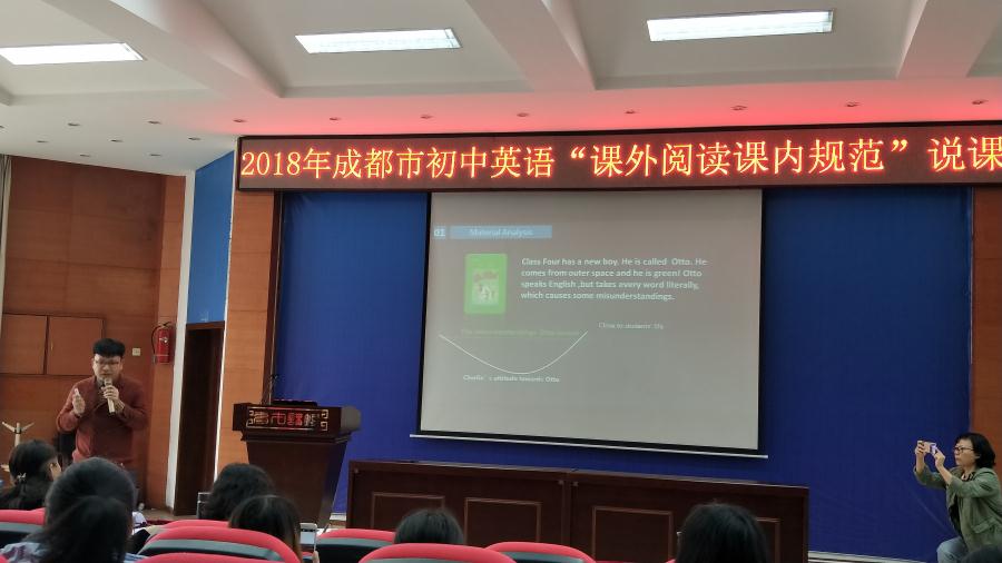 2018年10月22日至23日,成都市初中英语“课外阅读课内规范”课堂教学大赛在四川师范大学附属中学外国语学校举行。两天的赛程紧张激烈而又精彩纷呈,十五位教师各显神通,为观课的老师们带来了一场场教学盛宴。杨四维老师以扎实的教学功底、独特的教学设计、地道流畅的口语﹑灵活的现场反应和富有感染力的教学热情受到了大赛专家委员会和观摩教师们的一致认可,荣获成都市一等奖。