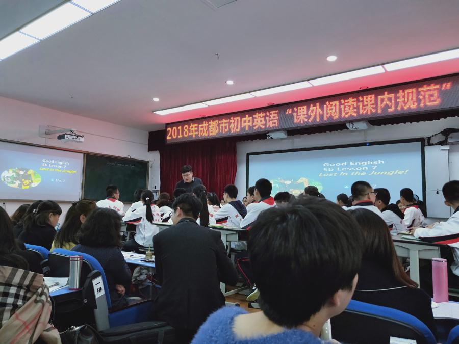 (图为杨四维老师参与成都市初中英语“课外阅读课内规范”教学展评赛课)