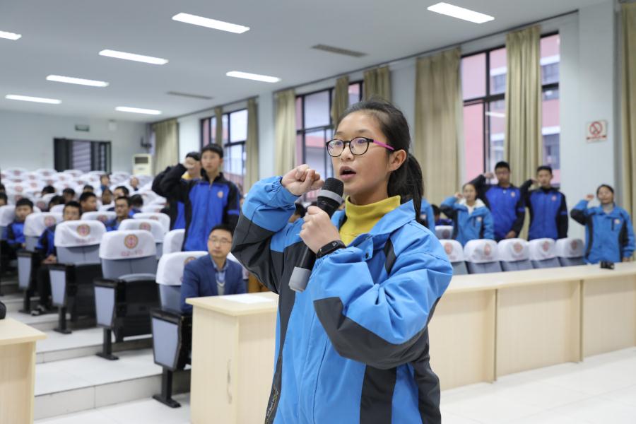 2018—2019届学生会主席杨温睿祎同学代表新一届学生干部代表发言。她表示:全体新当选的学生干部将铭记学校的重托、秉承往届学生会干部工作精神,勇当重担,认真工作,一定圆满地完成学校安排各项任务;在工作要努力进取,积极思考,不断超越,把我校的学生工作推向一个新的高度,开创我校学生会工作新的辉煌。