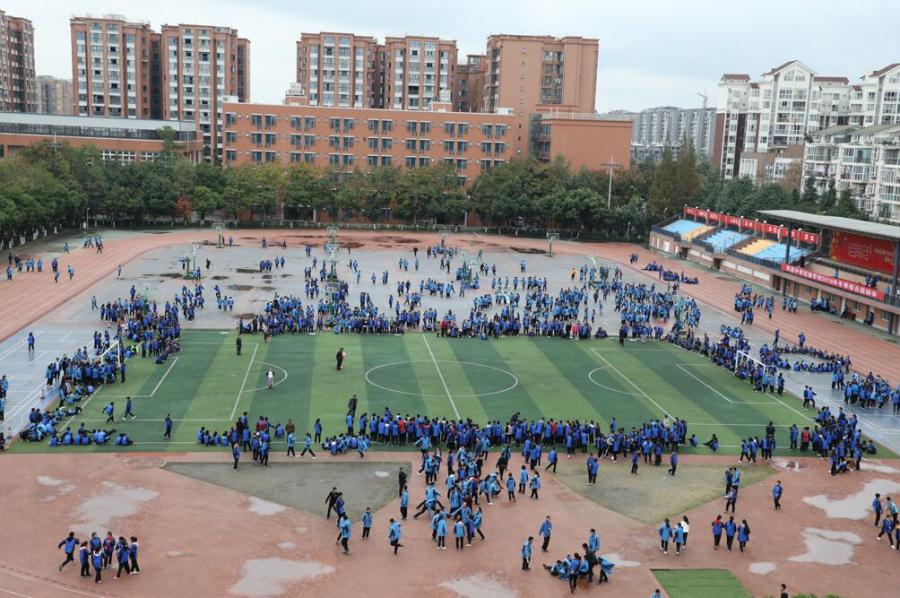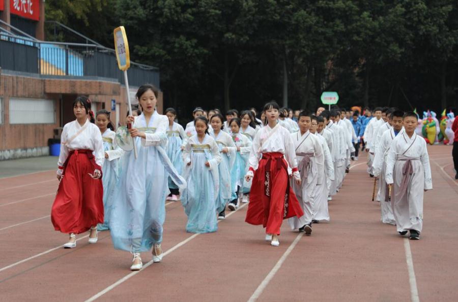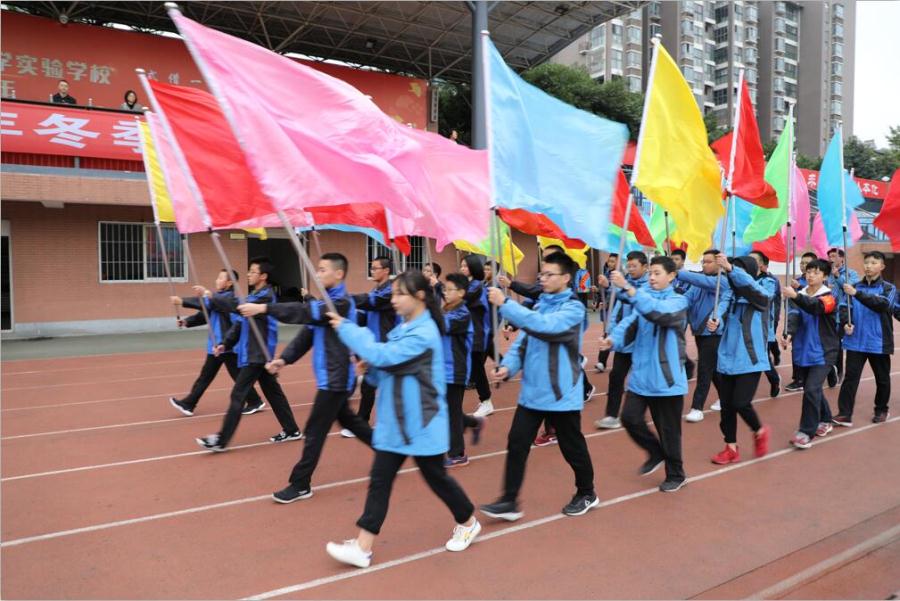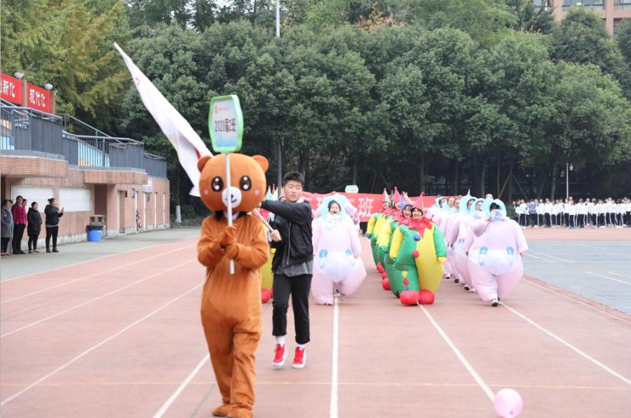 11月15日下午,踏着金黄的落叶,沐浴初冬的寒风,双流中学实验学校2018年冬季运动会隆重开幕。七八年级的同学们踏着整齐有力的步伐、喊着掷地有声的口号,伴着慷慨激昂的音乐陆续走入运动场,或扮成呆萌可爱的小丑娃、或身着清新淡雅的汉服、或手举霸气搞笑的标语口号……创意十足的入场方式、新奇搞怪的服饰装备、整齐铿锵的队列呈现出不同的班级风采,展示出双中实验学子活力自信、团结向上的精神风貌。