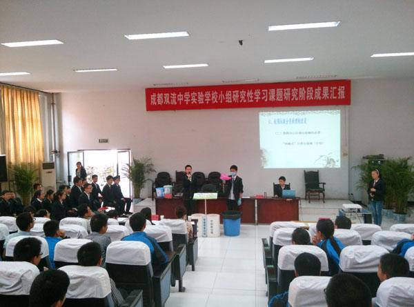 两周来,各课题小组的学生分别对《冰心诗歌》《传承历史文脉,守望精神家园—成都非物质文化遗产研究之走进川剧》《校园气象站》《迎外国友人,品双流风采—为双流国际化添“英”加“图”》和《双流县城垃圾处理现状及展望》等研究课题以图文并茂和作品展示的形式进行了形象生动的汇报展示。