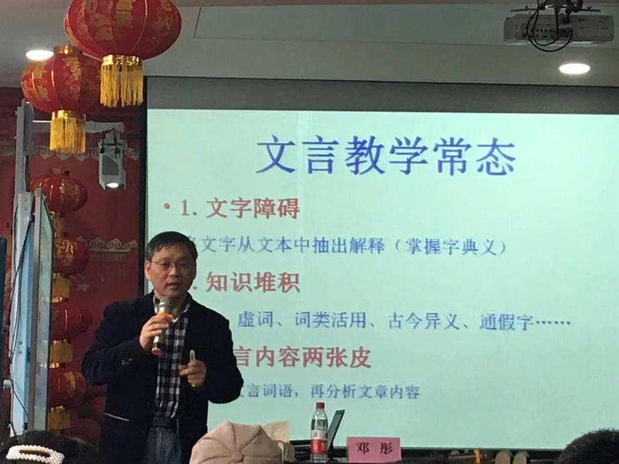 24日上午,全国著名特级教师邓彤带来示范课《与朱元思书》。文言文教学一直在“死”与“活”两端摇摆,过于追求“知识,能力”,文言课堂实则实矣,却沉闷乏味。邓老师的风趣和幽默让课堂灵动活泼,亲身示范了文言文教学模式的重构,让我们领略到了趣味文言的魅力。接着由著名特级教师刘飞耀带来示范课《茅屋为秋风所破歌》。听刘飞耀老师的课,不要说他带有磁性的声音,也不必说他活力四射的激情魅力,单是引导学生解读文本而言,那就让人心情舒畅,有如沐春风之感。